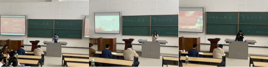 5名学生党员依次展示自己精心设计的主题党课,学生第一党支部孙建凤讲述的主题为“弘扬铁人精神,争做时代新人”,学生第二党支部平传升讲述的主题为“石油人,石油魂”,学生第三党支部卢婧迪讲述的主题为“铁人精神,大庆精神”,学生第四党支部王欣慰讲述的主题为“学习铁人王进喜”,学生第五党支部刘乾讲述的主题为“铁人精神代代相传,艰苦奋斗永向前”。