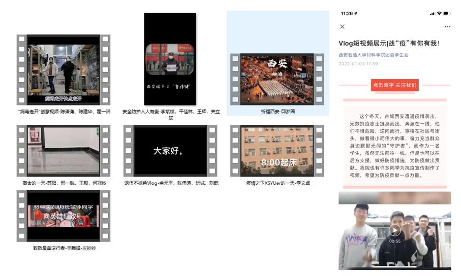 短视频大赛:各年级结合自身实际,举行Vlog短视频大赛,通过短视频的制作和宣传,为疫情防控助力加油。同学们采用不同的拍摄手法,内容新颖、形式多样、立意鲜明,从各个角度表现出广大学子全员抗疫的场景以及积极面对疫情的乐观态度。