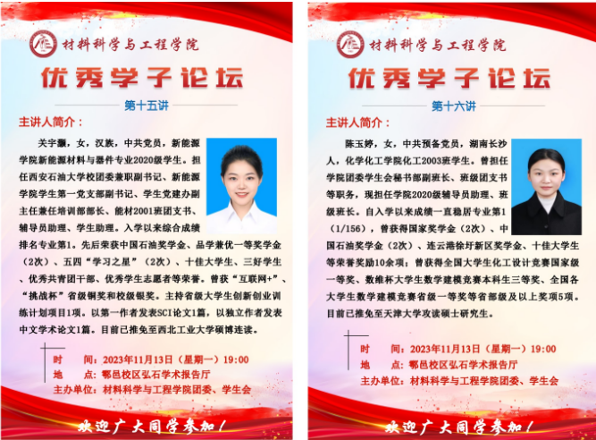 在鄠邑校区图书馆弘石学术报告厅举办优秀学子论坛第十五讲和第十六讲,本期邀请到的优秀学子是荣获国家奖学金、中石油奖学金等多项荣誉的新能源豪门国际