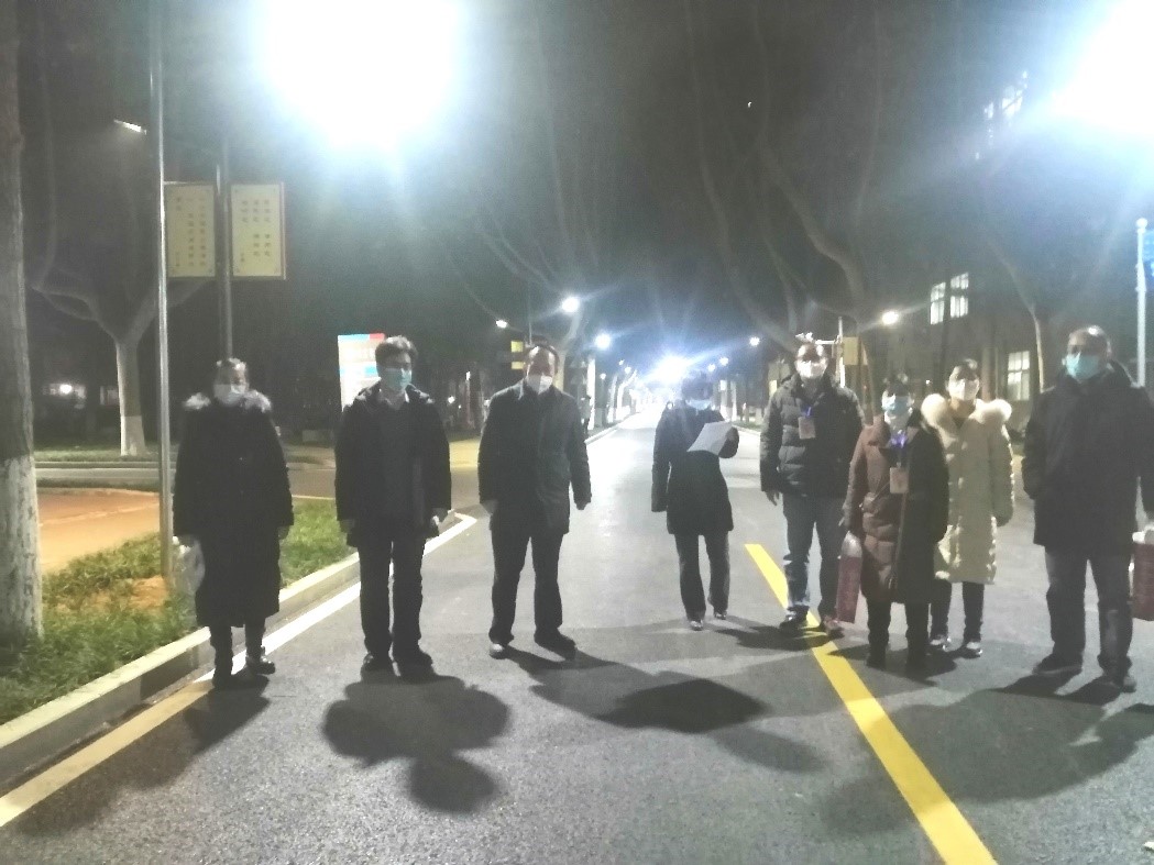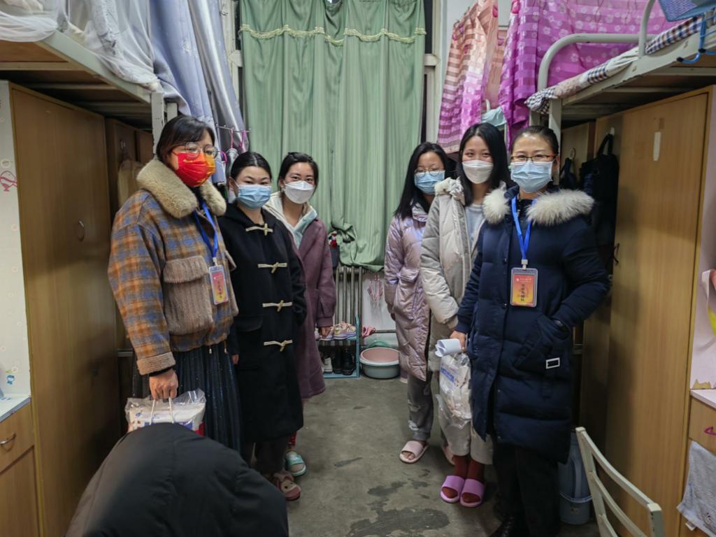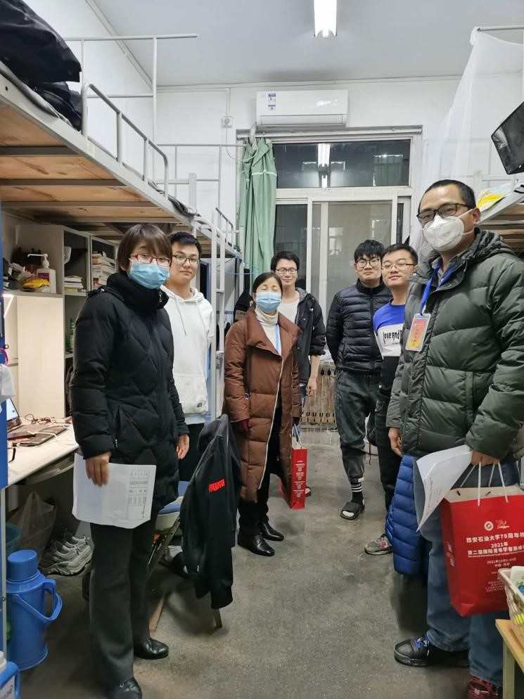 党员先锋队老师们分三组到雁塔校区1、2、3号楼看望研究生并发放防疫口罩。