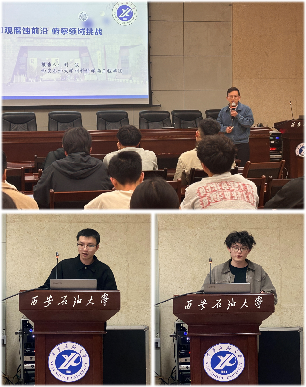 2023级硕士研究生陈震游、王子龙分别围绕气田采出水管道冲刷腐蚀失效、堆焊Fe-Cr-C合金组织性能优化分享了科研成果。两位研究生深耕各自研究领域,成果丰硕,已发表高水平学术论文并主持研究生创新项目。刘波老师立足腐蚀学科前沿作主旨报告,精准剖析了领域内的关键挑战与发展态势,并与在场学生深入交流,为拓宽师生科研视野、明晰研究方向提供了有力指导。