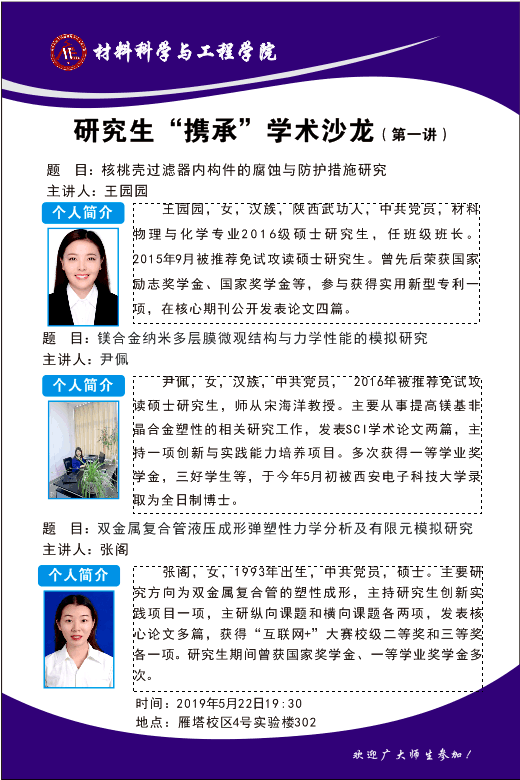 为了进一步完善人才培养机制,营造更好的学术氛围,创建良好的学术生态,激发研究生的创造智慧和创新潜能,为教师和研究生之间、研究生和研究生之间的学术沟通与合作搭建平台,豪门国际 研究决定,从2019年开始定期开展研究生“携承”学术沙龙活动。活动形式为邀请优秀的校外在读博士研究生和校内三年级研究生作学术报告,在场的老师及学生就相关主题开展深入交流研讨。