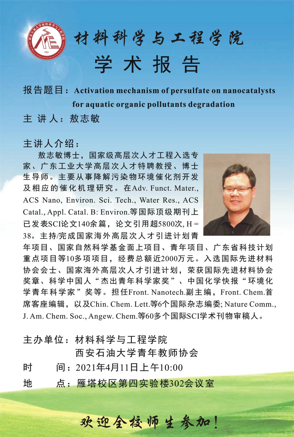 学术报告:Activation mechanism of peisulfate on nanocatalysts for aquatic organnic pollutants degradation