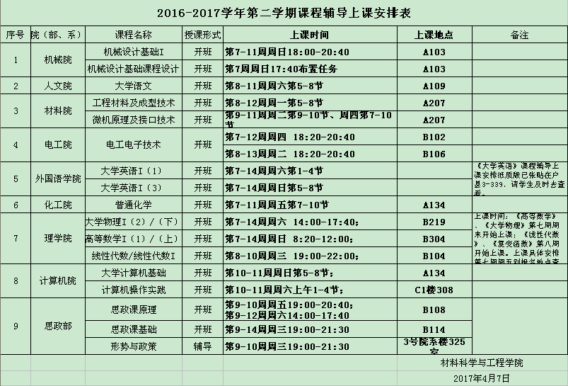 2016-2017学年第二学期课程辅导上课安排表