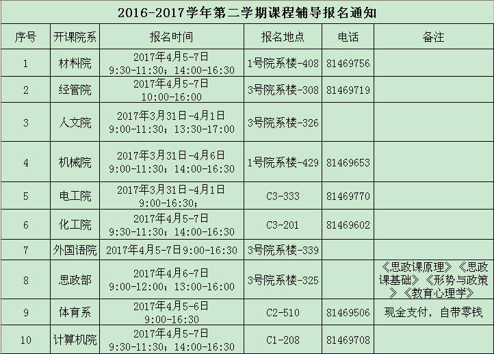 2016-2017学年第二学期课程辅导报名通知
